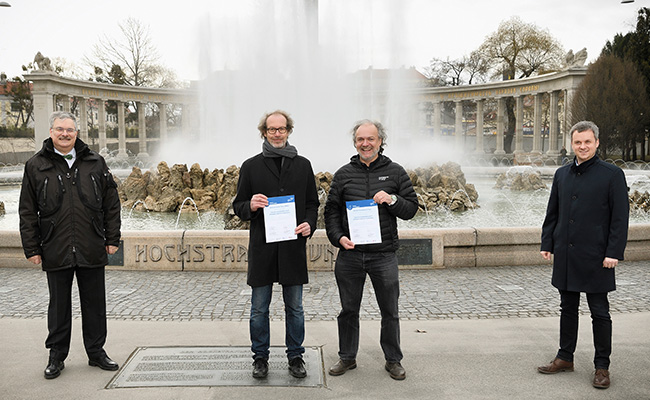 Foto v.l.n.r.: Baurat h.c. DI Roland Hohenauer, Österreichischer Wasser- und Abfallwirtschaftsverband, Assoc. Prof. Dr. Wolfram Graf, Universität für Bodenkultur, Univ.-Prof. PD. Dr. Andreas Farnleitner, MSc.Tox., KL, DI Paul Hellmeier, MA 31 Wiener Wasser